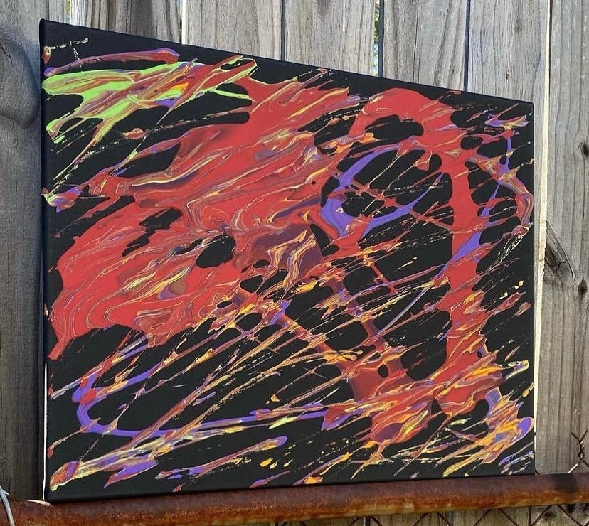 A out-of-this world style 16 by 20 painting that was done using the pour paint method and on a black canvas.