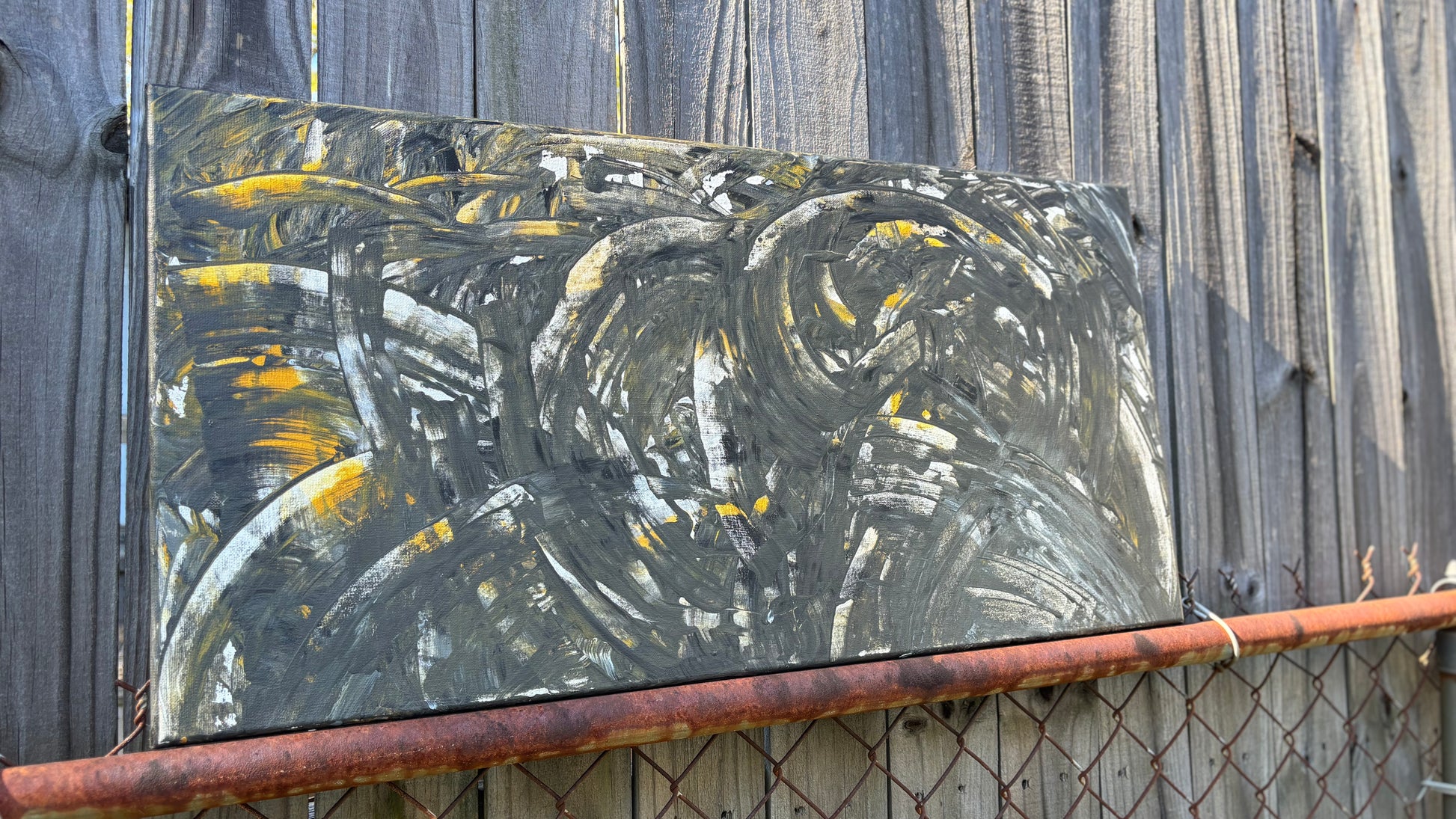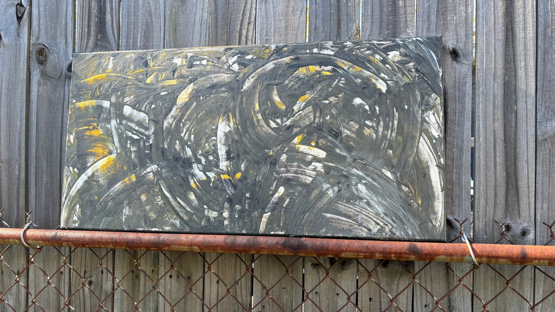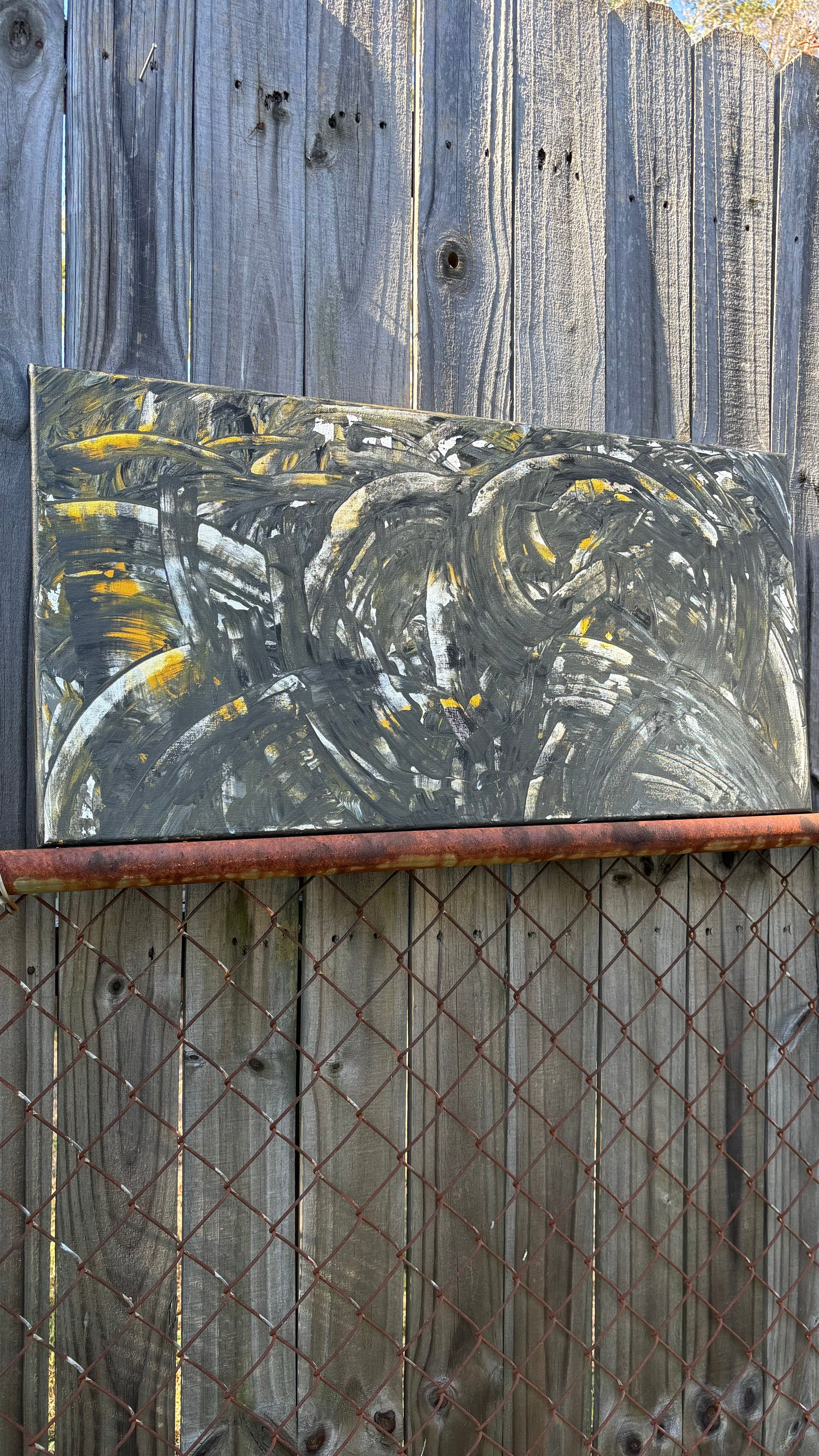 A dark 15 by 30, that’s eccentric and different. His artistry is different & I love the mystery behind this one! What can you see in this painting? The black, silvers, grays, white and hints of gold!