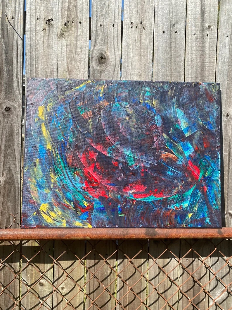 This beautiful acrylic abstract painting is brimming with the unexpected hues of red, blue, and pops of yellow, all created with one tool!
